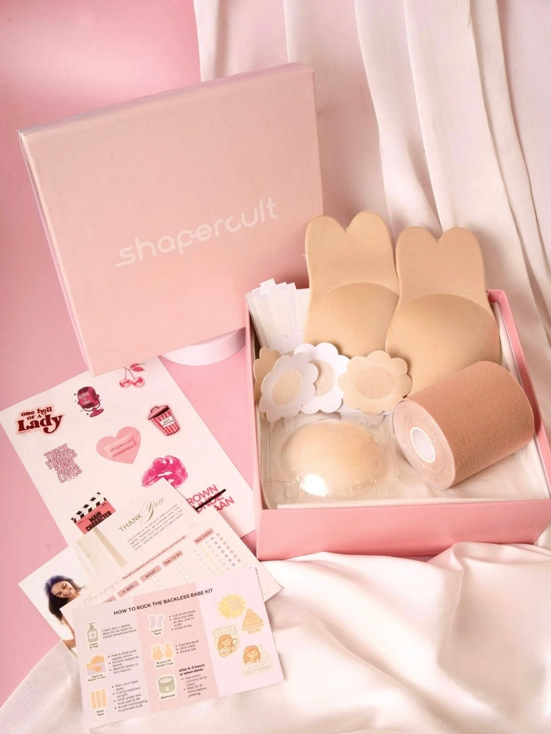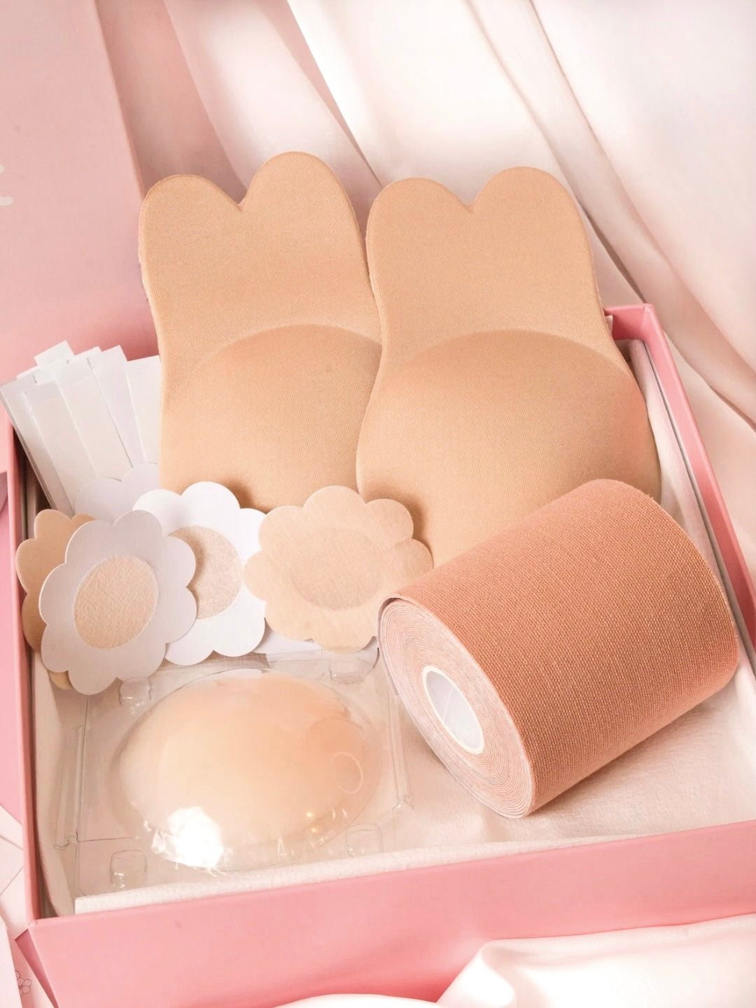 The Backless Babe Kit isn’t just a styling kit, it’s your confidence crew in a box. From body tape that lifts and lasts, to fashion tape that keeps your outfit drama-free, we’ve got your back (and front) Our nipple covers and pasties keep things smooth, secure, and oh-so-subtle, even in your boldest fits, and Breast lift rabbit cups, for that perfect push.